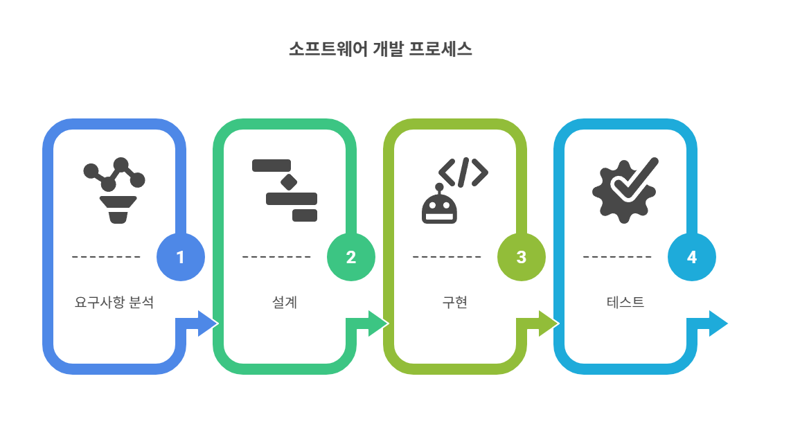 소프트웨어는 고객의 문제를 해결하는 등 고객의 요구를 충족시키기 위해 개발된다.소프트웨어 개발 프로세스는 구체화되지 않은 고객 요구사항에서 출발하여 단계를 거치면서 작동 가능한 코드로 변환하는 일련 활동을 의미한다. 요구사항 분석고객의 현재 업무에 대해 인터뷰를 진행하고 업무의 흐름과 규칙을 정리한 후 설계한다.사용자에게 제공해야할 기능은 유스케이스 모델로 정의한다.유스케이스 다이어그램유스케이스 기술서클래스 다이어그램이후 각 유스케이스를 구현하기 위해 필요한 기능을 정의한다.화면 단위, 업무 산출물, 외부 시스템 연동 등 설계요구사항 분석 단계에서 정한 요구사항 명세를 프로그래밍 언어, 프레임워크, 라이브러리를 사용하여 구현하는 방법을 구체적으로 계획한다.복잡한 대규모 시스템은 하나의 프로그램으로 처리..