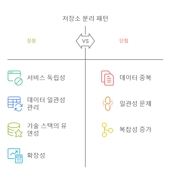 이벤트 소싱(Event Sourcing) 패턴은 마이크로서비스 아키텍처에서 데이터를 저장하고 처리하는 방법 중 하나로 시스템의 상태를 단순히 저장하는 것이 아니라 발생한 이벤트(event)를 순서대로 기록하고 이를 통해 상태를 재구성하는 방식이다. 핵심 개념이벤트 중심 저장데이터의 상태 변화는 이벤트로 기록된다.예를 들어, 은행 계좌의 잔액을 저장하는 대신 "입금", "출금"과 같은 이벤트를 기록한다.상태의 재구성현재 상태는 이벤트 로그를 순차적으로 재생(replay) 하여 재구성한다.이벤트 로그는 시스템의 단일 진실 소스(single source of truth)가 된다.불변성이벤트는 변경되거나 삭제되지 않고 불변(immutable) 성질을 가진다.모든 이벤트는 시간 순서대로 저장된다. 장점감사 및 추..